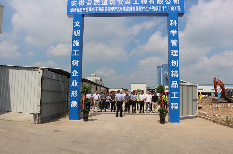 【概要描述】合肥市惠華電子有限公司在肥西縣嚴店鎮政府大力支持,安徽勞武建筑安裝工程有限公司、安徽鼎峰鋼結構科技有限公司大力協助,1#廠房完全具備施工條件,于2022年7月24日正式啟動1#廠房建設。